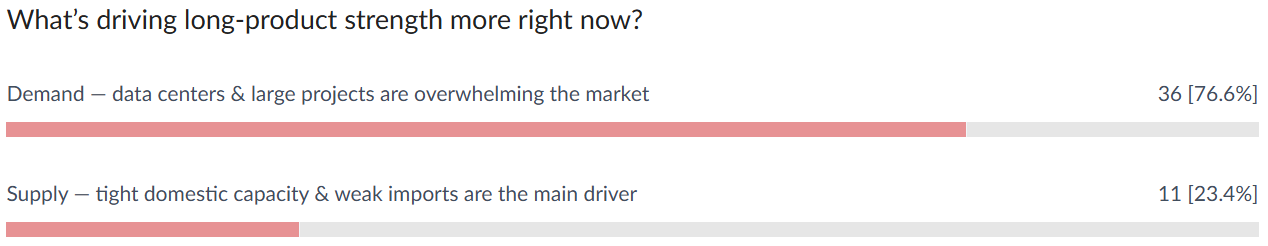 On the domestic long steel demand side, weekly discussions with market insiders once again focused on the US construction industry and its current demand driver in new data center construction projects, when compared with tepid residential and commercial construction activity.
